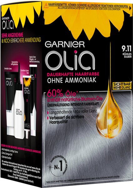 Garnier Olia Nr. 1.0 in Schwarz verleiht den Haaren ein langanhaltendes tiefes Schwarz. Die dauerhafte Haarfarbe ohne Ammoniak sorgt fü r intensive Farbkraft und geschmeidiges glä nzendes Haar. Die Colorations-Creme ist zu 60 % mit Ö len angereichert. Diese aktivieren die strahlende Kraft der Farbe indem sie die hochwirksamen Pigmente tief in der Haarfaser verankern. Auch graues Haar wird zuverlä ssig abgedeckt.Gleichzeitig verwö hnt die Coloration das Haar mit reichhaltiger Pflege fü r eine sichtbar verbesserte Haarqualitä t.Die cremig-samtige Textur von Garnier Olia tropft nicht und lä sst sich mü helos und gleichmä ß ig auftragen. Dabei entfaltet sie einen zart blumigen Duft. Anwendung: Machen Sie 48 Stunden vor der Anwendung den Allergieverdachtstest! Kleidung mit einem alten Handtuch abdecken Einweghandschuhe anziehen und den Aufheller in der beiliegenden Flasche entsprechend der Gebrauchsanweisung mischen.Die fertige Mischung nun direkt auf das trockene ungewaschene Haar auftragen: Zuerst in die Lä ngen und Spitzen und zum Schluss auf dem Haaransatz.Den Aufheller einwirken lassen und anschließ end mit warmem Wasser ausspü len.Eine haselnussgroß e Menge der Pflegekur in das Haar einmassieren und wieder ausspü len.