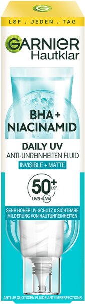Das Hautklar BHA + Niacinamid Daily-UV Anti-Unreinheiten Fluid Invisible + Matt LSF 50+ ist ein ultraleichtes Fluid das sich ideal zur tä glichen Pflege eignet. Dank seines hohen Sonnenschutzes mit Lichtschutzfaktor 50+ wird die Haut vor schä dlichen UVB UVA sowie langwellligen UVA-Strahlen geschü tzt. Die vegane Formel mit BHA und Niacinamid mildert zudem Unreinheiten wie Pickel Pickelmale und vergrö ß erte Poren ohne ein klebriges Gefü hl auf der Haut zu hinterlassen. Die nicht komedogene Tagespflege kommt ohne Duftstoffe aus und sorgt fü r ein ebenmä ß igeres Hautbild - auch bei empfindlicher Haut. Anwendung: Fü r einen effektiven Sonnenschutz das Fluid zunä chst gut schü tteln. Anschließ end jeden Morgen eine kleine Menge nach der Gesichtsreinigung und vor dem Make-up auf das Gesicht auftragen und gleichmä ß ig verteilen. Um den Lichtschutz aufrechtzuerhalten mehrfach auftragen. Ü bermä ß ige Sonneneinstrahlung und Mittagssonne vermeiden.