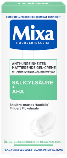 Die Anti-Unreinheiten mattierende Gel-Creme von Mixa ist eine leichte Gesichtscreme die speziell fü r ö lige zu Unreinheiten neigende Haut entwickelt wurde. Dafü r sind ihre Inhaltsstoffe optimal auf dieses Hautbedü rfnis abgestimmt. So enthä lt die Gesichtspflege zum einen Salicylsä ure sowie zum anderen AHA. In Kombination sorgen sie fü r ein bis zu acht Stunden anhaltendes ultra-mattes Hautbild ohne die Haut auszutrocknen oder sie zu reizen. Gleichzeitig mildert die schonende und hochverträ gliche Formel Pickelmale. Um die Wirksamkeit der Gel-Creme zu unterstü tzen kö nnen zusä tzlich der Anti-Unreinheiten Comfort Cleanser sowie das Anti-Unreinheiten Serum verwendet werden. Anwendung: Vor der Verwendung der Anti-Unreinheiten mattierende Gel-Creme von Mixa die Haut im Gesicht grü ndlich reinigen und anschließ end abtrocknen. Nun die Pflege auf die Gesichtshaut auftragen und mit sanft kreisenden Bewegungen einmassieren. Dabei die Augenpartie aussparen. Die Gesichtscreme kann tä glich morgens und abends als Abschluss der Hautpflegeroutine angewandt werden. Zudem lassen sich der passende Anti-Unreinheiten Comfort Cleanser sowie das Anti-Unreinheiten Serum optimal in ebendiese integrieren.