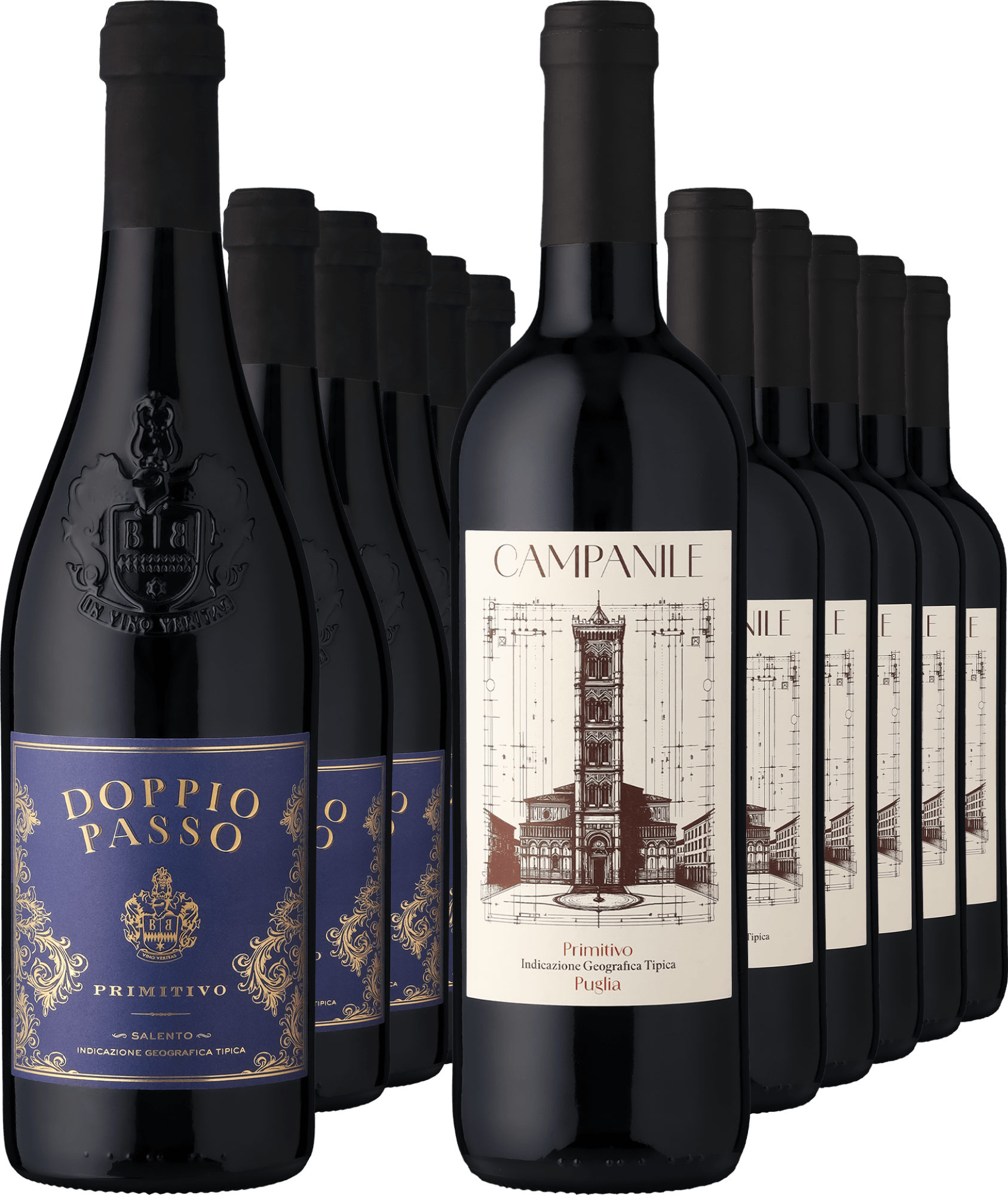 Zwei erstklassige Primitivos in einem Paket Die Rebsorte Primitivo – das dürfte angesichts der aus ihr entstehenden hochklassigen Weine klar sein – hat nichts »Primitives« an sich. Vielmehr entwickeln sich die würzig-eleganten und mit herrlichen Fruchtnoten betörenden Rotweine aus dieser Traube zu den Beliebtesten in unserem Sortiment. In diesem Sensationspaket erhalten Sie gleich zwei beliebte Primitivos in je sechsfacher Ausführung und – mit einer satten Ersparnis obendrauf!Der Doppio Passo Primitivo ist ein vollmundiger Rotwein aus Italien mit einer feinen Restsüße. Und ein absoluter Bestseller. Die süditalienische Spezialität besticht durch ihr dichtes Bukett von schwarzen Beeren reifen Kirschen und einladenden Kakao-Noten. Am Gaumen spürt man die sanften Tannine die dem Wein seinen charakteristischen Schmelz und eine weiche Struktur verleihen. Die konzentrierten Aromen und die feine Fruchtsüße setzen sich im Mund angenehm fort. Im langen Abgang klingt zudem eine feine Vanillenote an.Außerdem im Paket enthalten ist der kraftvolle Campanile Primitivo. Sechs Monate reift dieser Rotwein in großen Eichenfässern. Das Resultat ist ein Süditaliener wie wir ihn uns wünschen: Mit dunkler saftiger Frucht und würzigen Noten von Zimt und Nelke verführt er die Sinne. Am Gaumen zeigt er sich kraftvoll mit weichen Tanninen und einem langen Abgang. Genießen Sie ein Glas zur Brotzeit sowie zu Pizza Pasta oder einfach solo.
