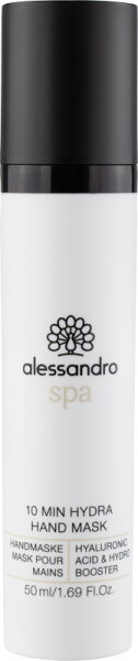 Die Alessandro 10 Min Hydra Hand Mask fö rdert die Restrukturierung der Hautbarriere und die Bildung von kö rpereigener Hyaluronsä ure und damit eine Vergrö ß erung der hauteigenen Feuchtigkeitsdepots (Hyaluronbooster). Erhö ht die Widerstandsfä higkeit der Haut.Vorteile- Mindert Hautirritationen- Schü tzt vor Austrocknung- Beruhigend- Feuchtigkeits­ spendend Anwendung: Tragen Sie eine groß zü gige Schicht auf die gereinigten Hä nde auf. Warten sie 10 Minuten und spü len diese dann mit warmem Wasser ab. Bei trockener Haut kann die Maske auch hä ufiger anwendet werden.