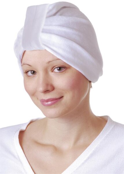 Kosmetik- und Saunahaube zum Schutz der Frisur. Leichtes softes Nicky-Material. Farbe: weiß.
