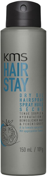 Das KMS HairStay Dry Oil Hairspray bietet flexiblen leichten Halt fü r bis zu 72 Stunden. Die schnell trocknende Formel sorgt fü r ein weiches glä nzendes Finish ohne zu kleben und bü ndelt und definiert Locken und Wellen. Es beseitigt Frizz und fliegende Haare um bis zu 90 % bietet lang anhaltenden Feuchtigkeitsschutz fü r bis zu 72 Stunden und verstä rkt den Glanz bis zu 2 Mal. Die Formel mit upgecycelter Tomate die als starkes Antioxidans bekannt ist hilft vor UV- und Umwelteinflü ssen zu schü tzen. Anwendung: Auf das trockene Haar sprü hen um den Look zu vollenden und zu fixieren. Das Haar durchkä mmen um ihm mehr Textur zu verleihen.