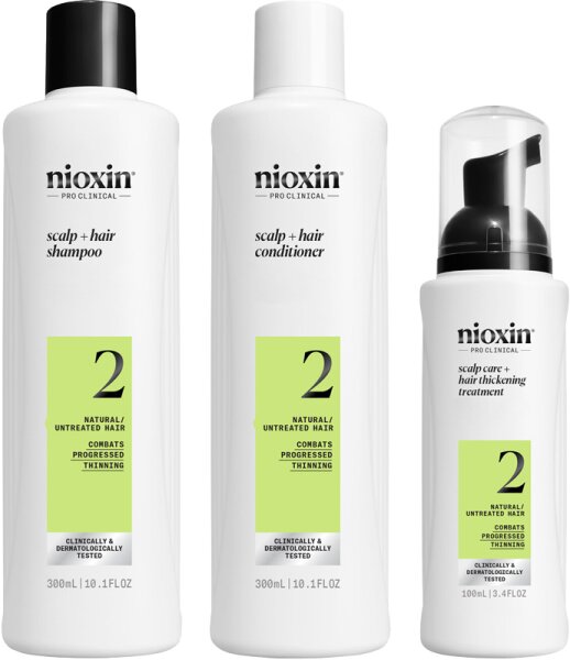 Das Nioxin Haarpflegesystem-Kit 2 fü r NATURBELASSENES SICHTBAR dü nner werdendes Haar schenkt der Haarstruktur mehr Volumen und SCHÜ TZT GEGEN HAARBRUCH. Dieses einzigartige PROFESSIONELLE dreistufige HAARPFLEGESYSTEM inspiriert sich an einem innovativen Hautpflegeansatz und wurde als spezielle Pflegebehandlung fü r krä ftigeres voller wirkendes Haar entwickelt. Das Nioxin Cleanser Shampoo befreit Kopfhaut und Haar von Verunreinigungen und ü berflü ssigen Fettsä uren. Der leichte Scalp Therapy Conditioner hilft die Widerstandskraft des Haares zu verbessern und Kopfhaut und Haar mit Feuchtigkeit zu versorgen. Das Nioxin Scalp & Hair Treatment erfrischt die Kopfhaut und schenkt jeder einzelnen Haarsträ hne mehr Volumen.Dieses Set beinhaltet:1x Nioxin scalp + hair shampoo 300 ml1x Nioxin scalp + hair conditioner 300 ml1x Nioxin scalp care + hair thickening treatment 100 ml Anwendung: Tä glich Shampoo und Conditioner in Kopfhaut und Haar einmassieren und gut ausspü len. Niacinamine Serum auf Kopfhaut und Haar geben. Nicht auswaschen.