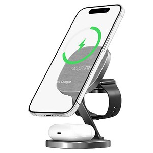 XLayer MagFix Pro 3 in 1 Wireless Charger GreyLaden Sie Ihre Apple Geräte bequem und kabellos an einem Ort. Der neue 3-in-1 MagFix Wireless Charger von XLayer lädt gleichzeitig MagSafe kompatible iPhone Modelle Apple Watches und AirPods. Der benutzerfreundliche Ständer nimmt Ihr iPhone im Hoch- oder Querformat auf. Das Platzieren mit Hilfe des integrierten Magnetringes garantiert effizientes Laden ohne Abbrüche durch die optimale Positionierung auf der Ladefläche. Die starken Magnete bieten 1.000 g Haltekraft für Ihr Smartphone und bieten somit eine sichere Andockung. Laden Sie gleichzeitig Ihre AirPods oder AirPods Pro sowie Ihre Apple-Watch und bringen Sie so Ihre ultimative Ladestation in Ihr Zuhause oder Ihr Büro. Für unterwegs lässt sich die Ladestation platzsparend zusammenfalten und findet so ganz leicht Platz in Ihrem Handgepäck. Mit dem 3-in-1 Wireless Charger von XLayer erreichen Sie ganz einfach mehr Ordnung auf Ihrem Schreib- oder Nachttisch und die Möglichkeit Ihre Apple Watch Ihr iPhone und Ihre AirPods gleichzeitig kabellos zu laden.Features:3 in 1 Ladestation mit MagSafeDer Alleskönner für iPhone Apple Watch und Air PodKompatibel für alle iPhones mit MagSafe (ab der 12ten Generation)Schnellladen mit 15W Wireless ChargingKein Verrutschen dank MagnetPraktisch zusammenfaltbarEinstellbare Neigung der MagSafe-Ladefläche1000 g Haltekraft für SmartphonesInklusive passendem USB Typ C auf USB Typ C-LadekabelGröße: 65 x 65 x 19 mmTechnische Spezifikationen:Input: Type C 5V 3A 9V 3AOutput: iPhone: 5W 7.5W 10W 15WAirPods: 3WApple Watch: 2.5WLieferumfang:1x XLayer MagFix 3 in 1 Wireless Charger Grey1x Kabel USB Typ C auf Typ C1x Gebrauchsanleitung
