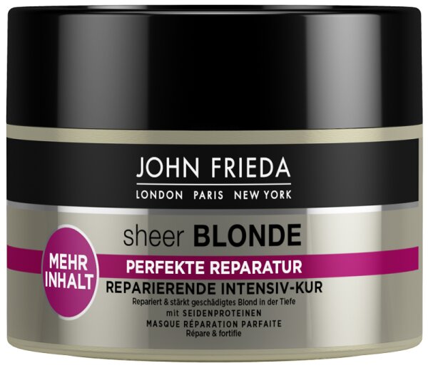 Entdecken Sie die John Frieda Go Blonder Intensiv Reparatur-Maske die perfekte Lö sung fü r blondes Haar das intensive Pflege und Schutz benö tigt. Diese hochwertige Haarmaske wurde speziell fü r blondiertes und aufgehelltes Haar entwickelt und bietet eine intensive Tiefenpflege um Ihre Haarstruktur zu stä rken und das Haar vor weiteren Schä den zu schü tzen. Die Formel der Go Blonder Intensiv Reparatur-Maske enthä lt natü rliche Zitrus- und Kamille-Extrakte die sanft blondierte Strä hnen aufhellen und fü r eine gleichmä ß ige Farbverteilung sorgen. Die reichhaltige Textur der Maske dringt tief in die Haarfasern ein um sie von innen heraus zu reparieren und das Haar geschmeidig und glä nzend zu machen. Mit der John Frieda Go Blonder Intensiv Reparatur-Maske kö nnen Sie Ihr blondes Haar intensiv pflegen seine Leuchtkraft und Farbbrillanz verbessern und gleichzeitig vor zukü nftigen Schä den schü tzen. Gö nnen Sie Ihrem Haar die besondere Pflege die es verdient!Vorteile:- Haarmaske- speziell fü r blondiertes und aufgehelltes Haar- enthä lt natü rliche Zitrus- und Kamille-Extrakte- verbessert die Leuchtkraft und Farbbrillanz und schü tzt das Haar vor zukü nftigen Schä den Anwendung: Die verbindliche Angabe der Anwendung entnimmst du bitte der Verpackung bzw. der beiliegenden Bedienungsanleitung des gelieferten Produktes.