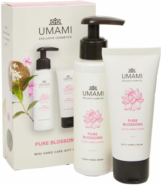 Das Umami Pure Blossoms Mini Hand Care Gift-Set ist das ideale Geschenk fü r Hä nde die sich ein samtweiches Hautgefü hl wü nschen. Das Geschenk-Set beinhaltet zwei sanfte Handpflege-Produkte mit einem angenehmen Duft von Lotus und Jasmin.Die Umami Pure Blossoms Hand Wash ist eine kö stliche Handseife. Schenken Sie Ihren Hä nden wä hrend des Waschens eine feuchtigkeits­ spendende Behandlung. Der einzigartige Duft von Lotus und Jasmin verleiht Ihren Hä nden ein wunderbares Dufterlebnis. Beenden Sie das Waschritual anschließ end mit der pflegenden Handlotion.Die Umami Pure Blossoms Hand Cream ist eine reichhaltige Handcreme. Sie sorgt dafü r dass trockene Hä nde regeneriert und mit Feuchtigkeit versorgt werden. Die Creme zieht schnell ein und macht die Haut wieder geschmeidig.Das Set enthä lt:1x Umami Pure Blossoms Hand Wash 100 ml1x Umami Pure Blossoms Hand Cream 50 ml Anwendung: Umami Pure Blossoms Hand Wash:Waschen Sie die Hä nde mit dieser herrlichen Seife und spü len Sie sie ab mit Wasser. Schließ en Sie das Waschritual ab mit der nä hrenden und beruhigenden Handlotion.Umami Pure Blossoms Hand Cream:Reiben Sie Ihre Hä nde mit der Handlotion ein. Zieht schnell ein.