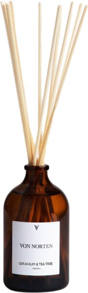 Von Norten Geranium & Tea Tree Diffuser bietet Ihnen einen außergewöhnlichen Duft höchster Qualität. Hochwertige Inhaltsstoffe wie ätherische Öle von Geranium Lavendel und dem hochwirksamen Teebaum schaffen ein beruhigendes und erholsames Raumklima. Die oben genannten Aromadüfte werden in der Therapie zum Finden der inneren Balance eingesetzt. Ätherische Öle im Diffuser bieten in der geschickt ausbalancierten Kombination eine gewisse Frische im Raum und wirken feinstofflich auf das Nervensystem und tiefergehend auf die astrale Ebene. Sie fühlen sich durch den aromatischen Duft einfach wohler.Brandneuer Duft der Luxusmarke Von NortenDiffusoren der Edelmarke Von Norten sind etwas Besonderes. Sie eignen sich wunderbar als Geschenk für einen lieben Menschen. Der Geranium & Tea Tree Diffuser ist ein neues Produkt der Marke das sie exklusiv bei uns erhalten. Gönnen Sie sich selbst damit etwas Gutes. Die Diffusoren werden mit den Rattanstäbchen im Glas dekorativ platziert und können nach Bedarf gewendet werden damit sich das Aroma noch intensiver entfaltet.