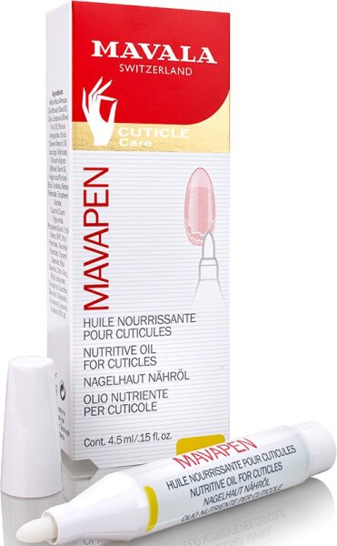Der handliche Stift fü r eine gepflegt aussehende Nagelkontur. Mit einer einzigen Anwendung hinterlä sst MAVAPEN nä hrendes Ö l und macht so die Nagelhaut weich und nä hrt sie. Mit weicher Filzspitze um die Nagelwurzel zu schonen. Anwendung: Das nä hrende Ö l mit der Filzspitze auf die Nagelkontur auftragen so oft wie Sie es wü nschen. In Kreisbewegungen einmassieren und einziehen lassen. Um Verletzungen der Nagelhaut bei Anwendung zu vermeiden nicht mit zu viel Druck auftragen. Bevor Sie Unterlack und Lack auftragen entfernen Sie jegliche Spuren von Ö l oder Fett von der Nagelplatte mit einem mit Nagellackentferner geträ nkten Wattepad.