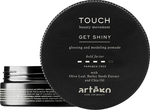 Die Artego Touch Get Shiny Pomade ist ideal zum Modellieren und kreieren von perfekten Wet-Looks mit wunderbaren Glanz und mittelstarken Halt. Mit farbschü tzender Wirkung und UV-Schutz. Lockert das Haar auf und definiert es.Vorteile- Modellieren und kreieren von Wet-Looks- Wunderbarer Glanz- Farbschü tzende Wirkung- UV-Schutz Anwendung: Eine kleine Menge des Produktes in den Hä nden verteilen auf das handtuchtrockene Haar auftragen und wie gewohnt stylen.